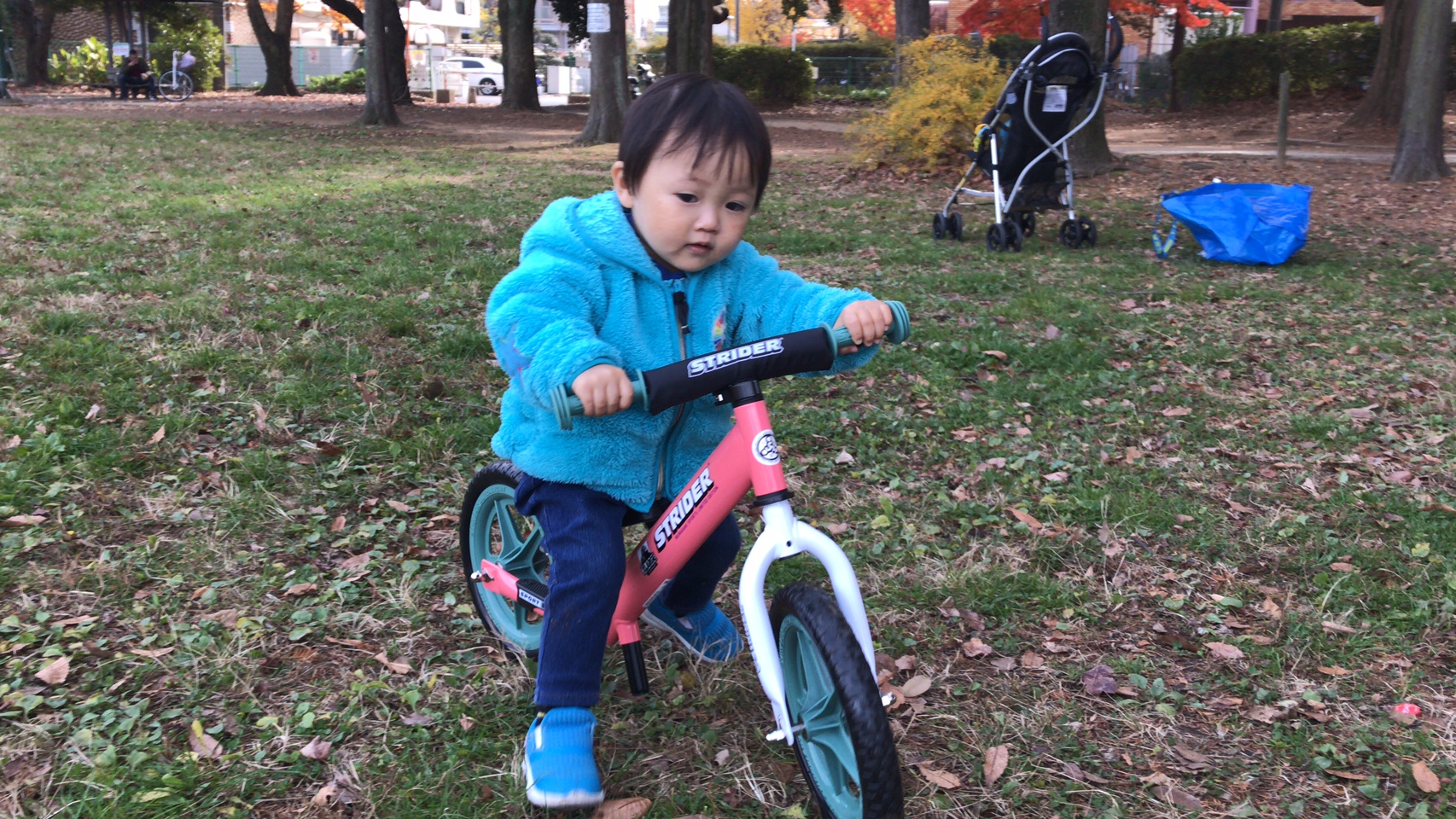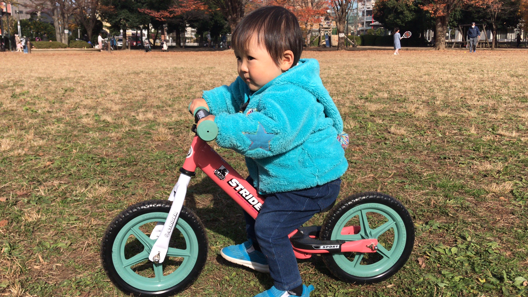足漕ぎ三輪車にずっと乗っていたせいか、難なくストライダーを操作するたいちゃん👶🏻