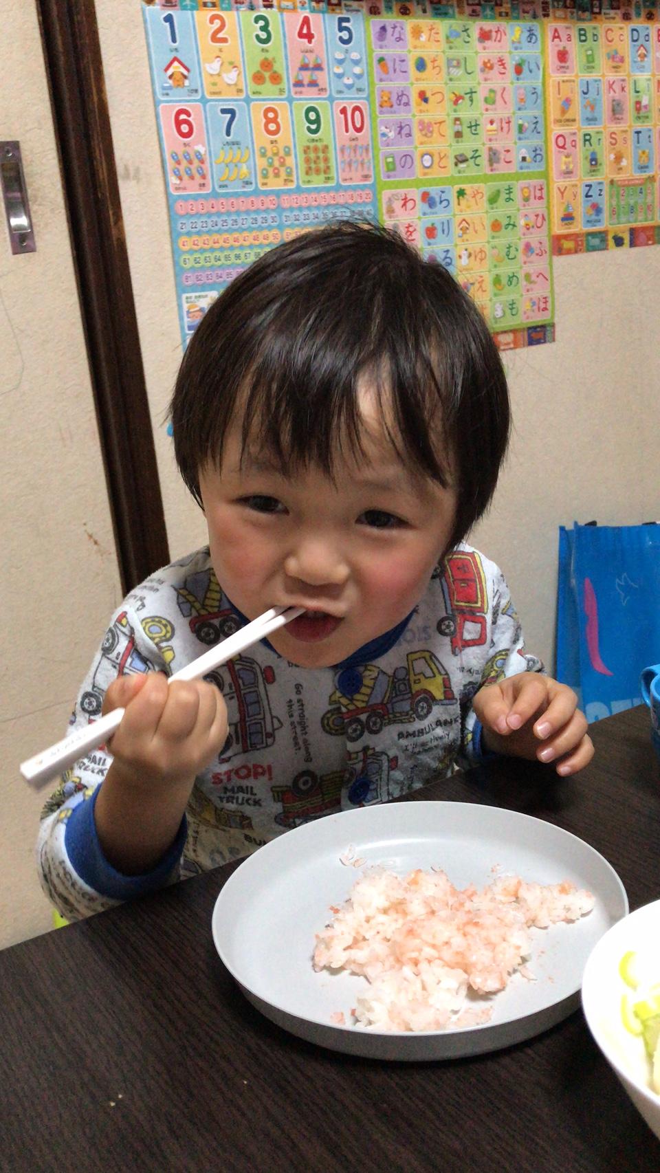 僕お箸で食べられるよ 突然上手にお箸を使って食べ始めるたいげんくん。 え!?いつの間に!?🥢 保育園で習ってるんだって😮